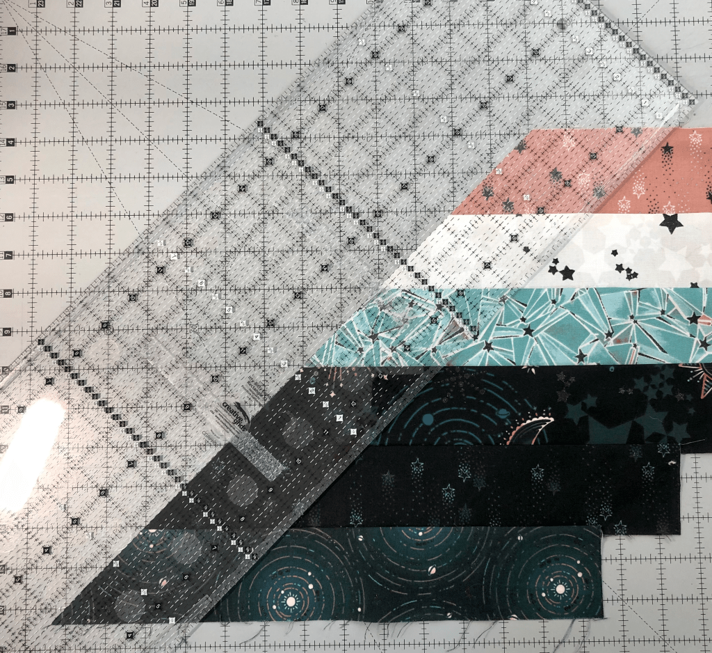 Maybe you have a different ruler. The Squedge 45 degree ruler has a flat top that will line up with the top of a rectangle or strip as does the smaller Creative Grids Kaleidoscope and Dresden 45 degree ruler, CGRTKAL45. If you use another 45 degree or kaleidoscope ruler that includes the triangle tip but it’s not blacked out or marked in some way to eliminate the excess fabric, you will need to cut your kaleidoscope triangles at 4 ⅞” (or even 5″ but you’ll trim more) when the sharpest point is included.