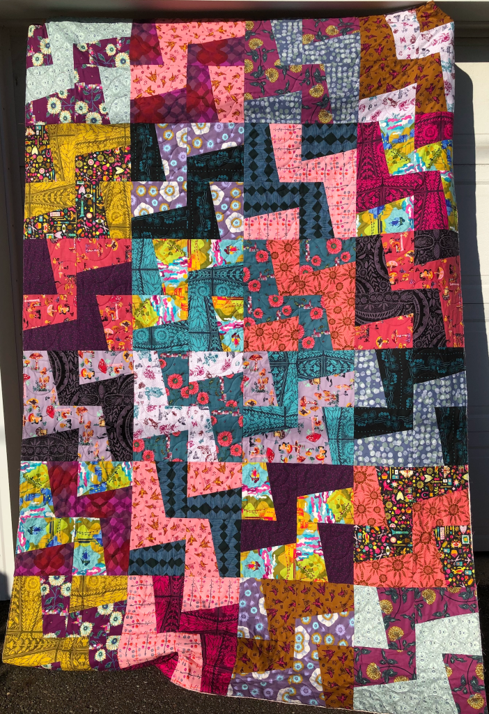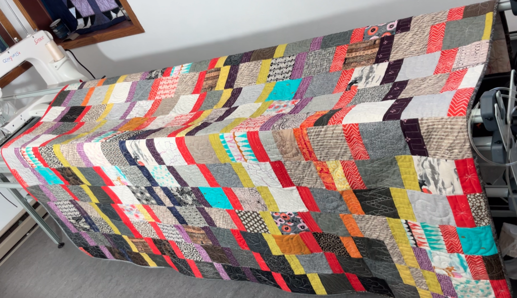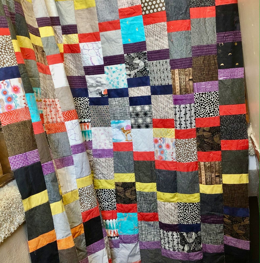 Lastly, sew this mandible unit to the front of the body unit to make your completed Patchwork Millennium Falcon! It should measure 8 ½” wide by 11 ½” tall unless your mandibles were a little shorter… This one’s my upcycled one which I *do* really love the striped fabrics in it.
