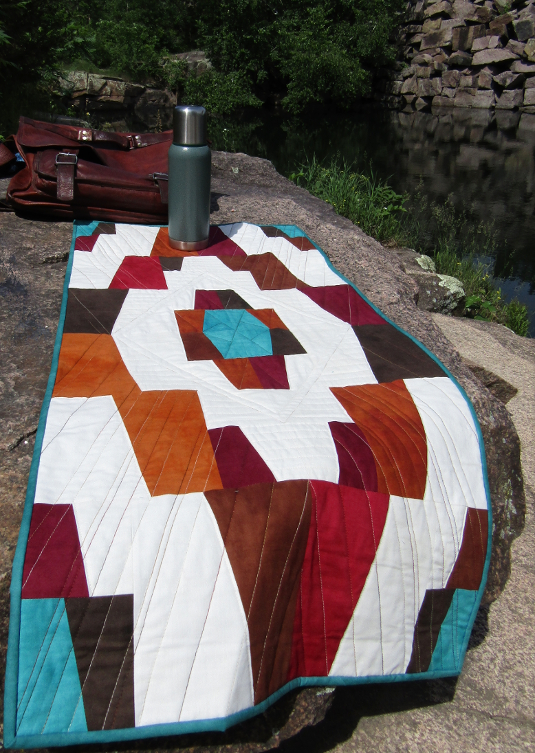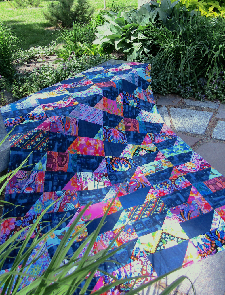 Piece your (8) 45 degree triangles into a kaleidoscope center. I usually do (4) pairs proceeding around the kaleidoscope, then pairs of pairs to get half the kaleidoscope, then the (2) halves together.