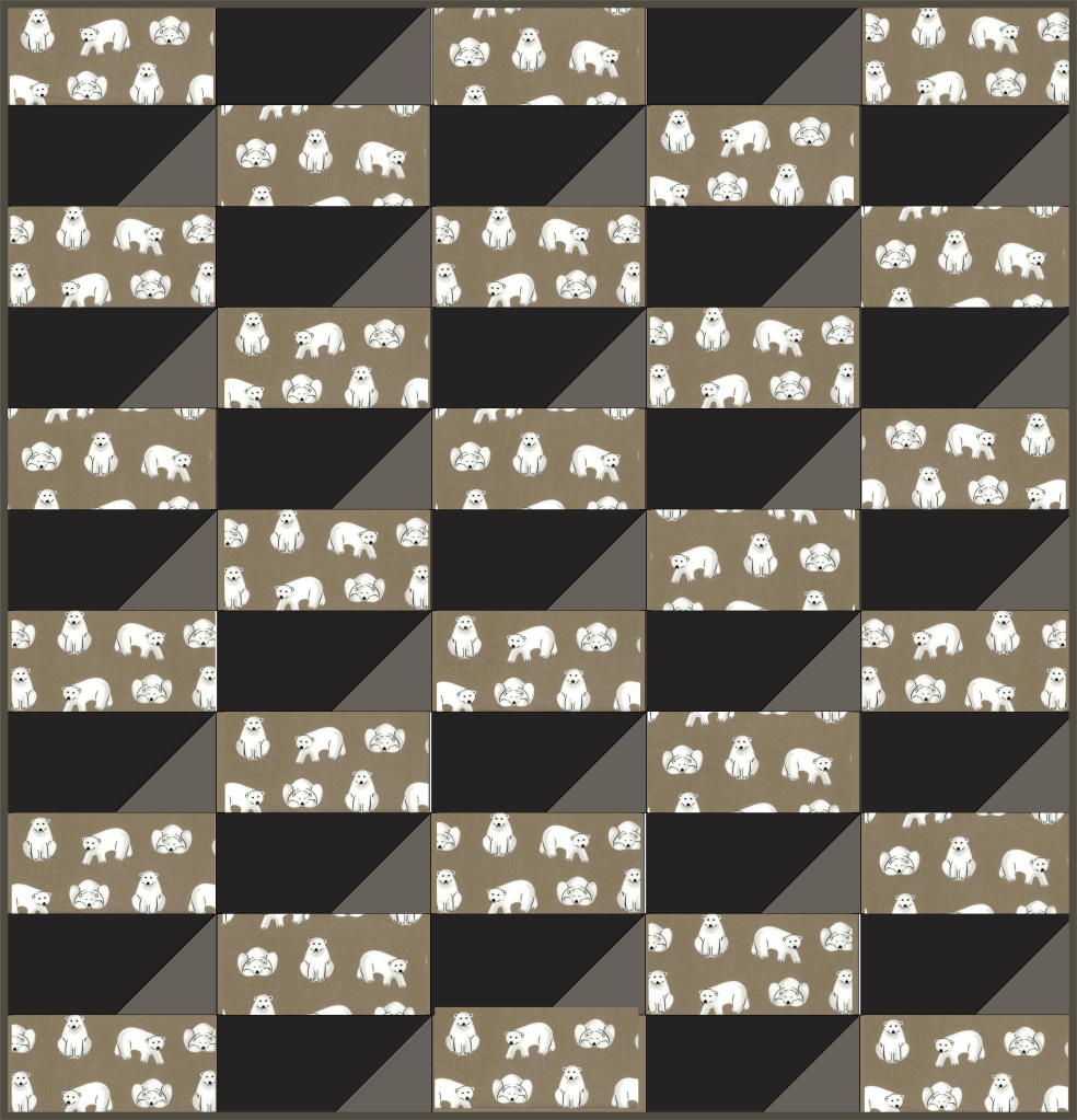 Stitch this last strip to the long light edge of a mandible unit, then stitch on the other mandible unit. Take care to make sure when you open everybody up they are oriented this way: